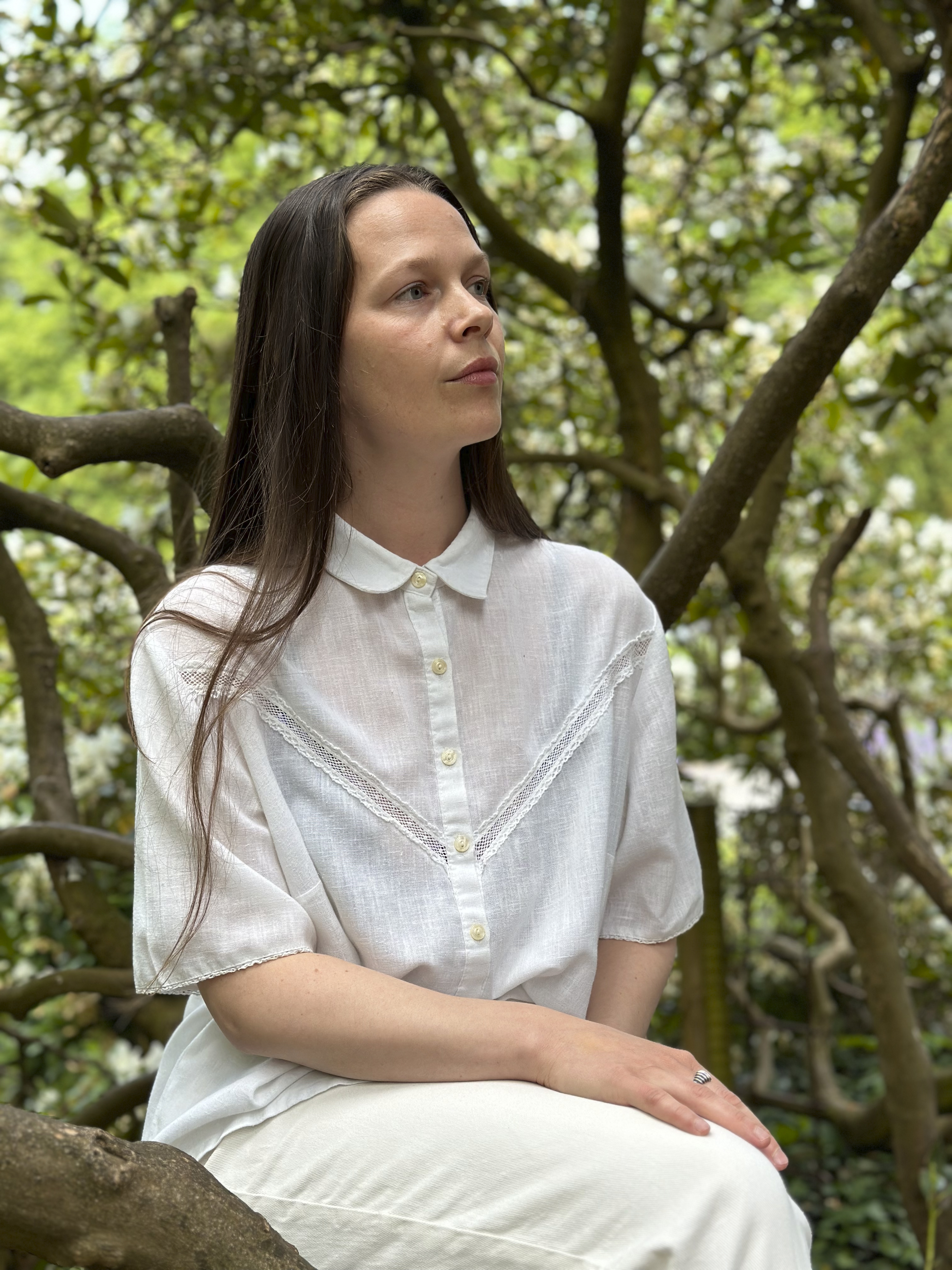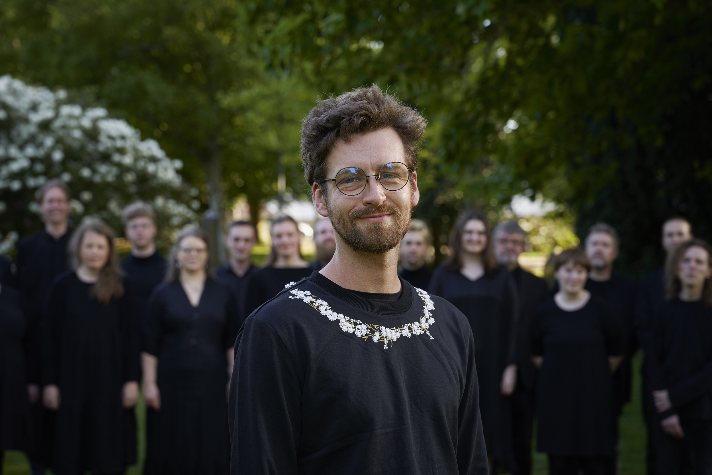“Hands in blossom” er en komposition for talekor. Vi kender klangen fra “fader vor” eller trosbekendelsen, når menigheden reciterer en tekst fælles. Det kan være stærkt at høre en stor menneskemængde tale i enklang, når alle er fokuseret på det samme - en slags trylleformel, noget magisk, en bøn. Og for mig er denne følelse meget anderledes end at synge stiliseret korsang. I min komposition undersøger jeg hvad det kan, at tale sammen, hvor ens vi kan lyde og hvor langt man kan fjerne sig fra hinanden og stadigvæk opleve sammenhæng? Derudover eksperimenterer jeg også med udvidet stemmebrug, lyde fra kroppen og fagter. Jeg er meget taknemmelig for at koret tillidsfuldt kaster sig ud i noget lidt “mærkeligt” og er åbent for improvisation.